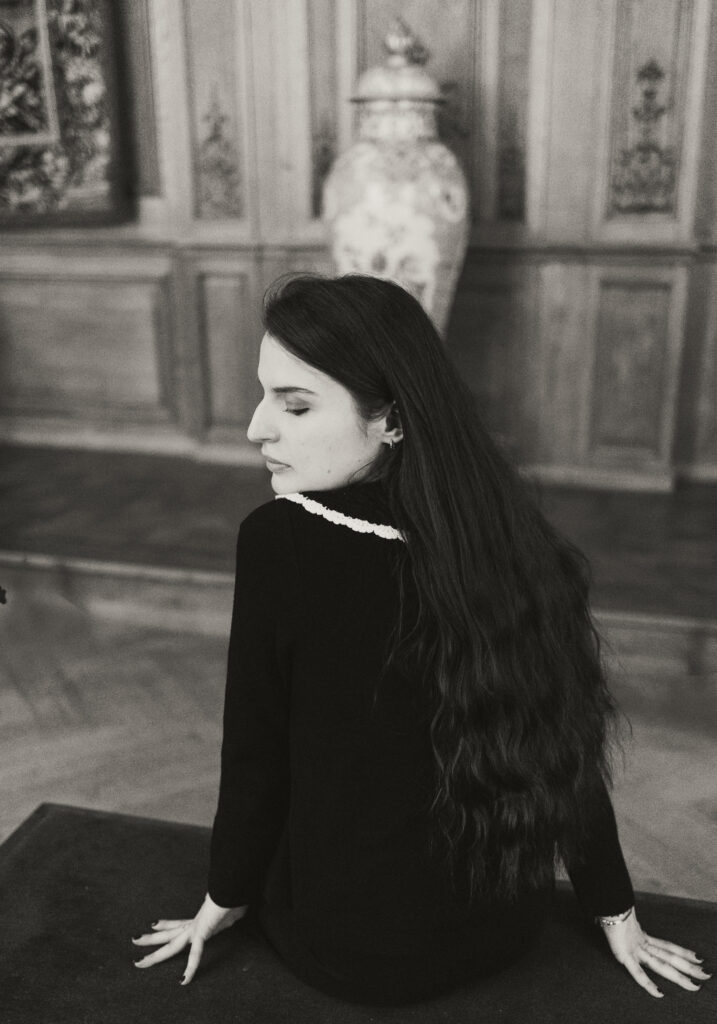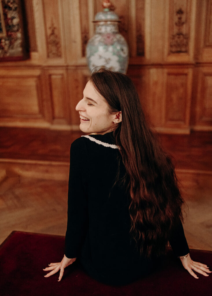 Nous avons commencé à l’intérieur, en flânant de pièce en pièce. La séance est un espace vivant et collaboratif : je propose des idées de poses à Camille, et elle me fait aussi part de celles qui lui viennent à l’esprit. Tout se fait avec fluidité et naturel. La beauté et l’unicité des œuvres qui nous entourent s’harmonisent parfaitement avec la personnalité douce et lumineuse de Camille. Entre rires, découvertes artistiques et échanges complices, la séance prend rapidement des airs de moment suspendu.